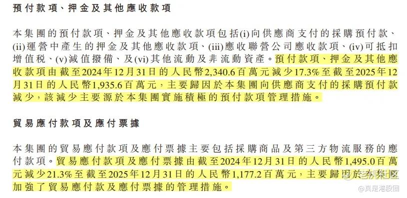 如果进一步看资产负债表里的细项,这种改善其实更清楚。首先,预付款项、押金及其他应收款项从 2024 年末的 23.41 亿元降至 2025 年末的 19.36 亿元,同比下降 17.3%,公司在年报中明确解释,主要是因为向供应商支付的采购预付款减少,背后反映的是其对预付款项管理更积极。