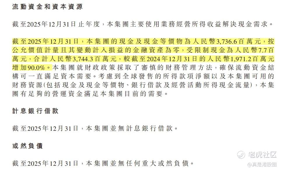 从财务上看,到 2025 年末,公司现金及现金等价物为 37.37 亿元,连同受限制现金合计 37.44 亿元,同比增长约 90%;资产负债率从 43.7% 降至 35.8%;截至年末没有计息银行借款。