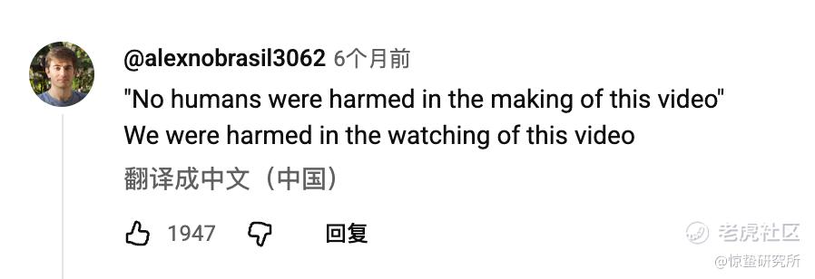 在YouTube平台上,也有网友指出短片中存在“镜头移动不自然”“说话声音和面部表情不一致”等硬伤。不过,更多网友们的关注点还是落在了“AI和真人抢工作”的话题上。例如其中一条高赞评论,就引用短片开头“本视频制作过程中无人受到伤害”的声明,调侃道“观看本视频的我们却受到了伤害”。还有网友表示,AI正在抢走导演、演员、化妆师、摄影师等工作机会,这绝对会伤害到人类。
