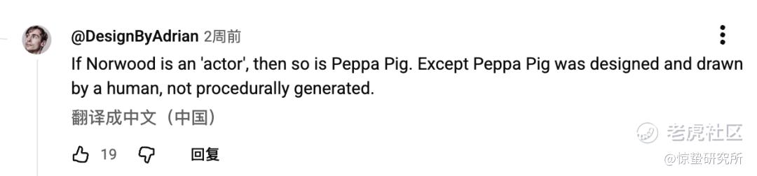 可惜的是,公众舆论对于AI演员的恐慌仍然没有被打消,网友们依然没有放下关于“AI演员合理性”的批驳。有网友评价“如果诺伍德是‘演员’,那么小猪佩奇也是。只不过小猪佩奇是由人类设计和绘制的,而不是程序生成的”,还有网友将枪口对准了AI音乐,表示“它具备成为好歌的一切要素,但人类其实喜欢不完美”。