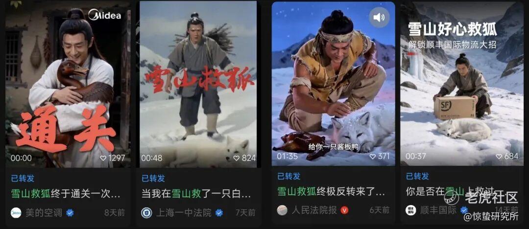 不到半个月后,“雪山救狐狸”的AI短视频刷屏全网。从普通网友到官媒、央媒、政务媒体纷纷下场,最终发展成了一场全民二创。但当所有人被“雪山救狐狸”的AI短片逗得哈哈大笑时,似乎又很少有人在意片中的角色也是AI生成的。