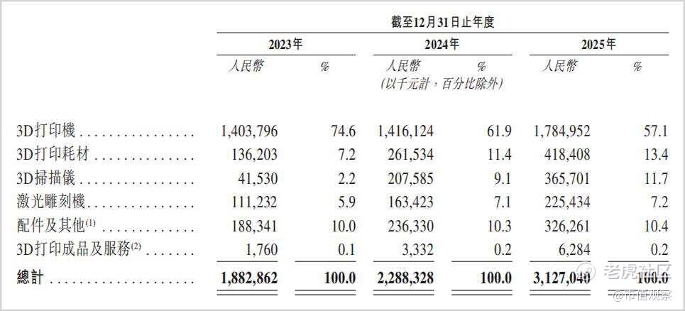 面对竞争,创想三维也在打造多元化业务,除了核心业务支柱3D打印机外,还扩展了耗材、3D扫描仪、激光雕刻机、配件等。2025年3D打印机的收入占比已降至57.1%,耗材、3D扫描仪增长较快,占比均提升到了10%以上。