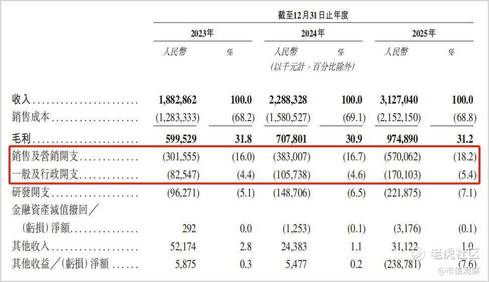 近年来,创想三维的费用开支对盈利的挤压越发明显,占大头的营销开支由2023年的3.01亿增加到2025年的5.7亿,占营收比重从16%提升至18.2%。