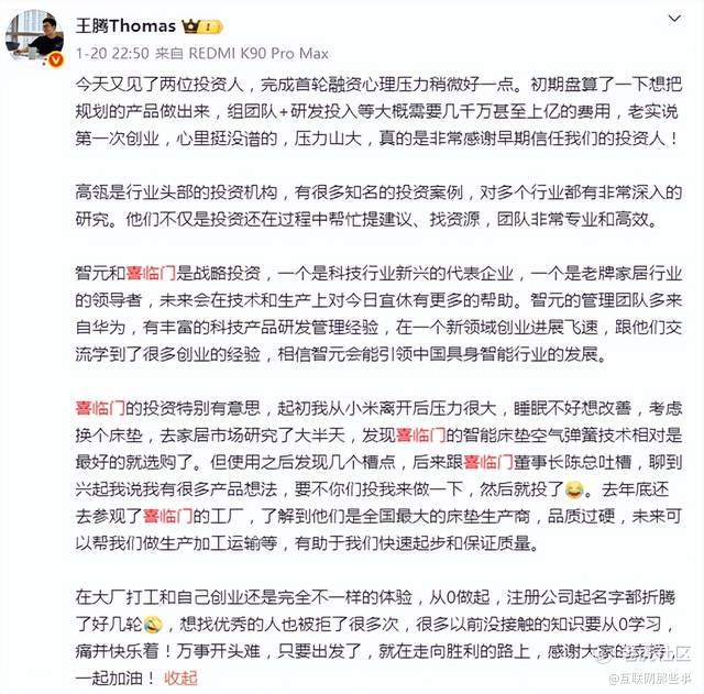小米前高管王腾创业公司、同样主打睡眠科技概念的今日一休,因获得了喜临门的战略投资而引发关注,王腾甚至详细给网友描述了是如何与喜临门实控人、董事长陈阿裕结缘的。