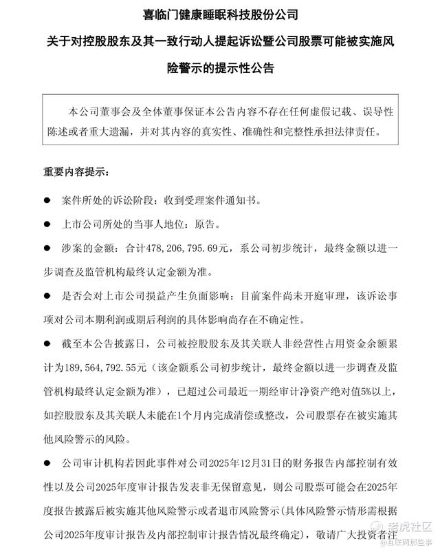 喜临门还提示,公司审计机构若因此事件对公司2025年12月31日的财务报告内部控制有效性以及公司2025年度审计报告发表非无保留意见,公司股票可能会在2025年度报告披露后被实施其他风险警示或者退市风险警示。