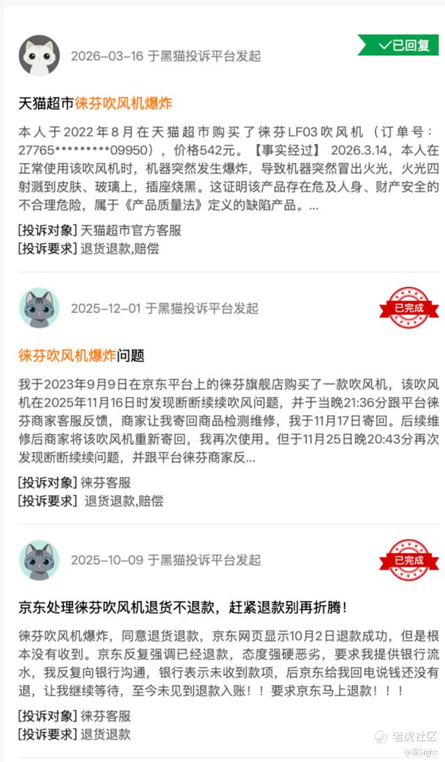 这并非孤立案例。黑猫投诉平台数据显示,明确标注“徕芬吹风机爆炸”的投诉达到12条,整体质量缺陷相关投诉累计超过170条。