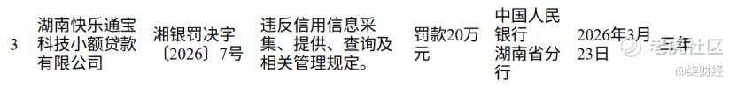中国人民银行湖南省分行行政处罚决定信息公示表显示,湖南快乐通宝科技小额贷款有限公司(以下简称“通宝小贷”)被处罚款20万元,事由指向违反信用信息采集、提供、查询及相关管理规定,
