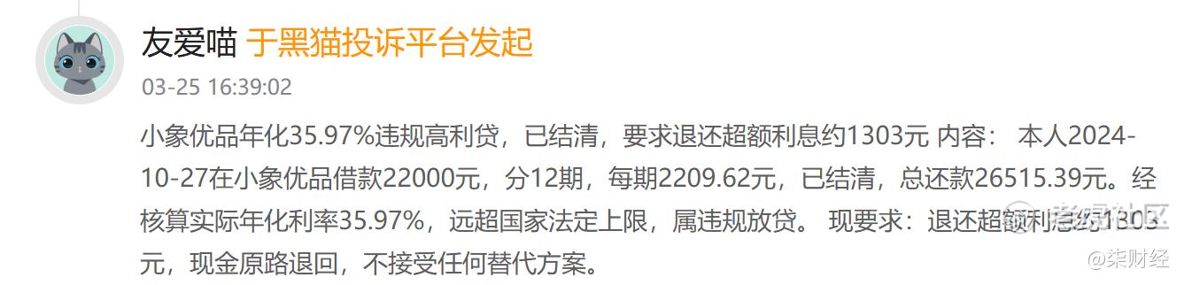 “2024-10-27在小象优品借款22000元,分12期,每期2209.62元,已结清,总还款26515.39元。经核算实际年化利率35.97%,远超国家法定上限,属违规放贷。”