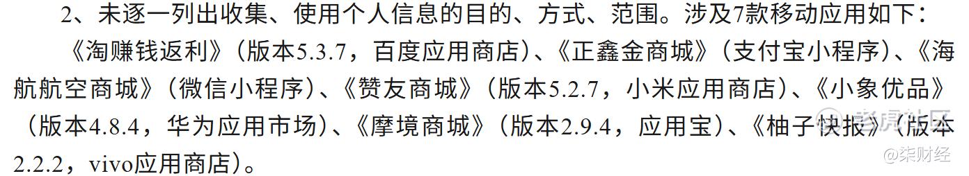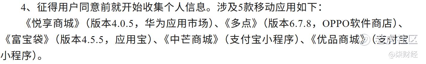 从类型来看,被通报的移动应用绝大多数为商城,既有实物类商城,也有不少将贷款包装成商城业务的分期电商,后者中包括知名度较高的《优品商城》和《小象优品》,违规原因分别为征得用户同意前就开始收集个人信息;未逐一列出收集、使用个人信息的目的、方式、范围。