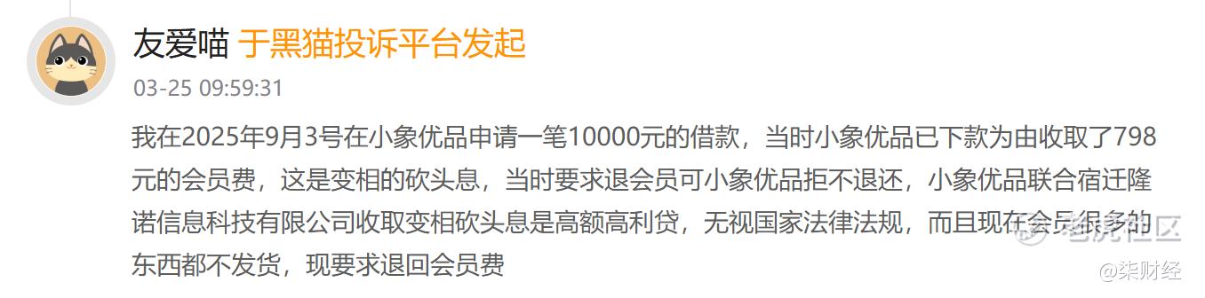 比如,有用户反映,“2025年9月3号在小象优品申请一笔10000元的借款,其以下款为由收取了798元的会员费,这是变相的砍头息……”