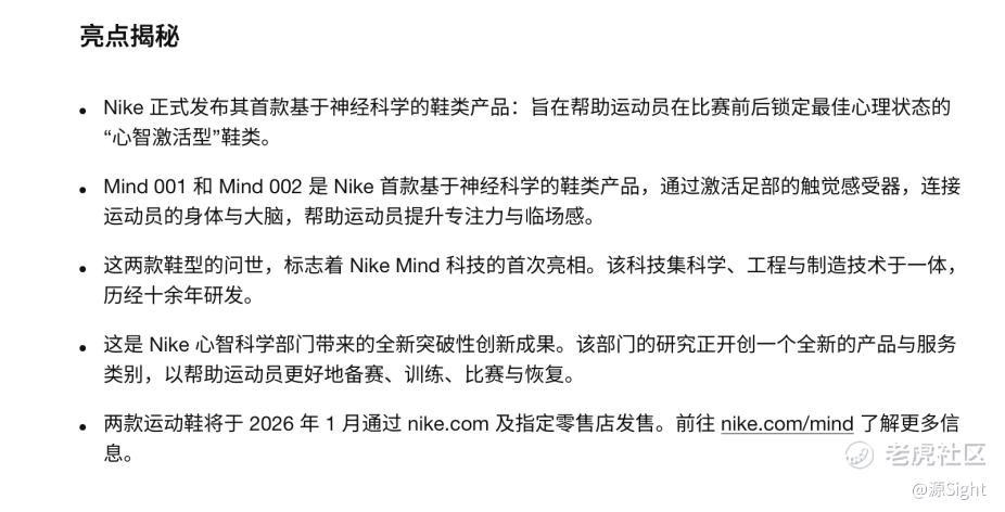 一方面,Mind 001是耐克心智科学部门首款落地产品、承担着神经科学+运动装备的全新品类开创、品牌创新与业绩突破的使命;另一方面,耐克近年侧重企业文化与价值营销,Mind 001则有望将其品牌理念转化为可感知的产品体验。