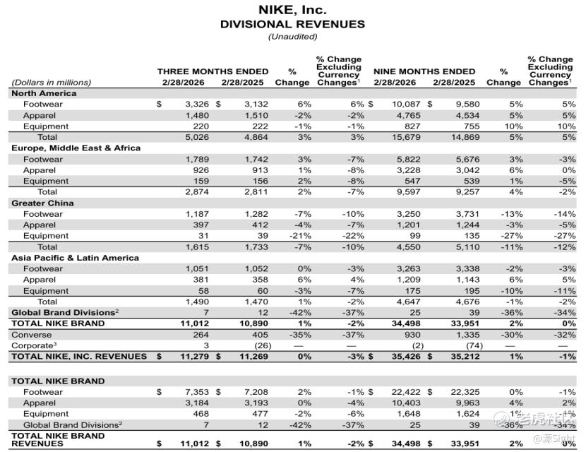 除北美地区出现复苏迹象,NIKE耐克在欧洲、中东和非洲地区(EMEA)、大中华区等市场收入均出现下滑,抵消北美增长;Converse匡威则在所有地区出现下滑。