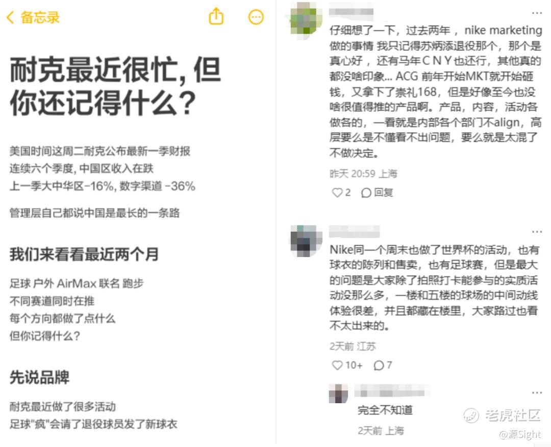 从实际效果来看,耐克或许过于侧重企业文化重塑与价值营销,但在关键市场、具体产品上缺少切实改变。其连续多季度收入下滑的大中华区市场、零星且难以延续的爆款表现等可见端倪;同时,耐克坚持的“赢”文化,与当下社会情绪或也存在错配。