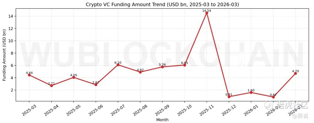 2026 年 3 月 Crypto VC 总融资金额约为 46.96 亿美元,环比 442.29%(2026 年 2 月为 8.66 亿美元 ),同比 5.79%(2025 年 3 月为 44.39亿美元)。近一年走势如下: