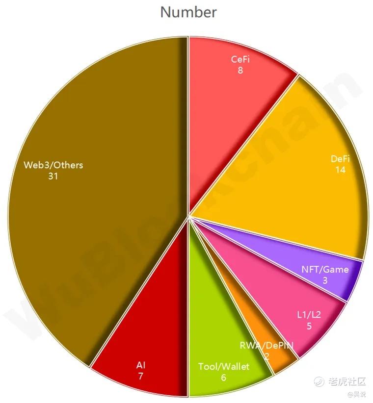 其中,CeFi 占比约 10.5%,DeFi 占比约 18.4%,NFT/GameFi 占比约 3.9%,L1/L2 占比约 6.6%,RWA/DePIN 占比约 2.6%,Tool/Wallet 占比约 7.9%,AI 占比约 9.2%。各板块赛道的项目数量如下: