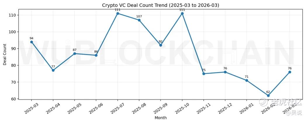 根据 RootData 统计,2026 年 3 月 Crypto VC 公开的风险投资项目共 76 个,环比上22.58%(2026 年 2 月为 62 个项目),同比 -19.15%(2025 年 3 月为 94 个项目)。近一年走势如下: