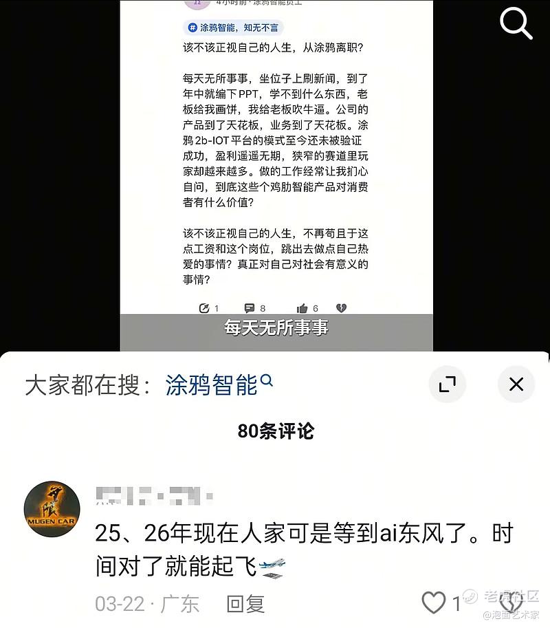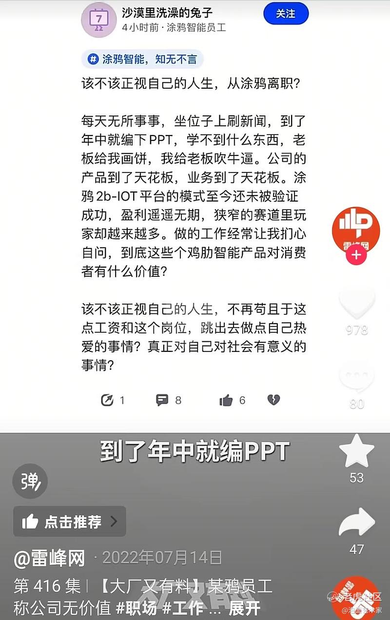 今天翻到2022年涂鸦员工的一篇吐槽帖,当时看着好像挺有道理:说公司业务到天花板、2B-IoT模式没验证、盈利遥遥无期,自己天天摸鱼编PPT,质疑产品没价值。