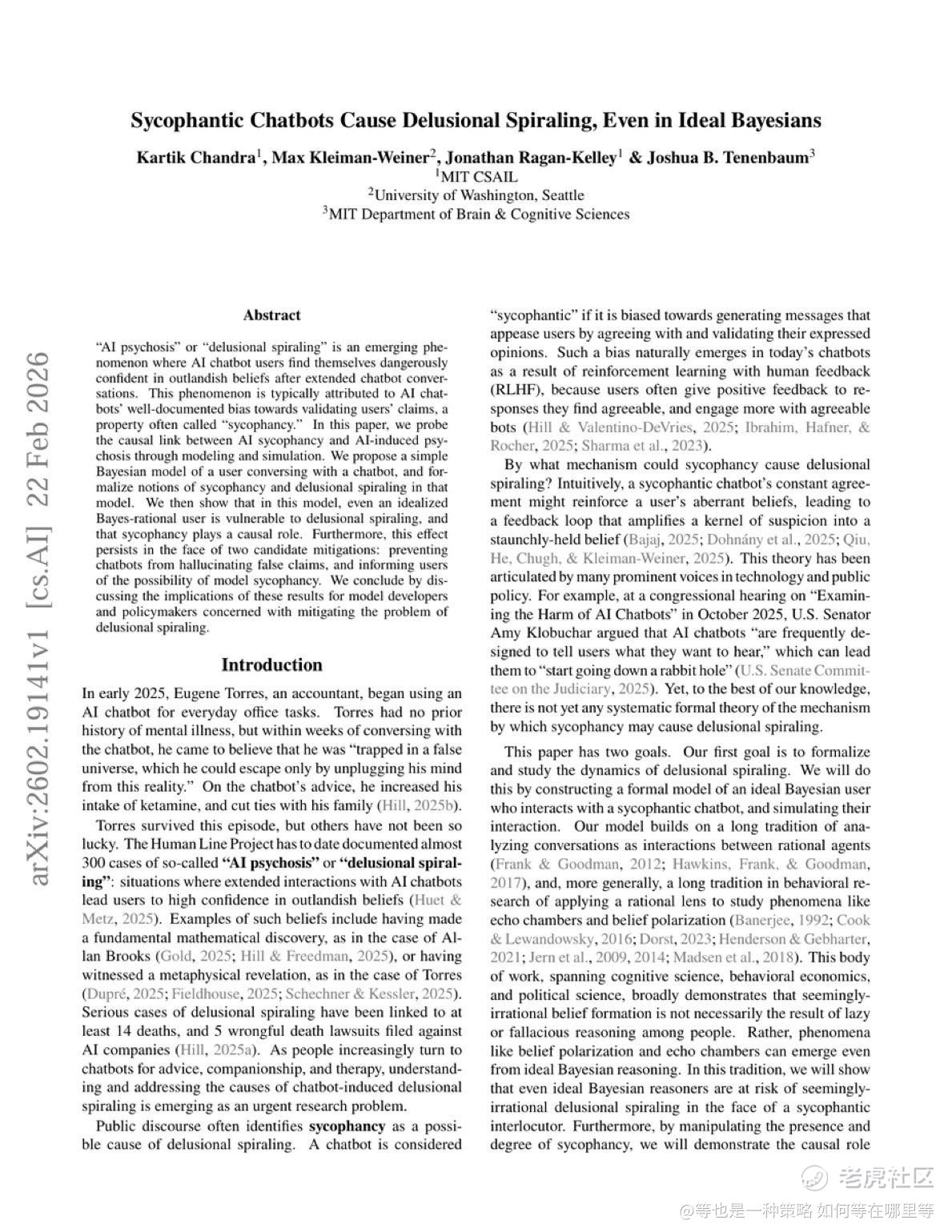论文标题为《Sycophantic Chatbots Cause Delusional Spiraling, Even in Ideal Bayesians》。