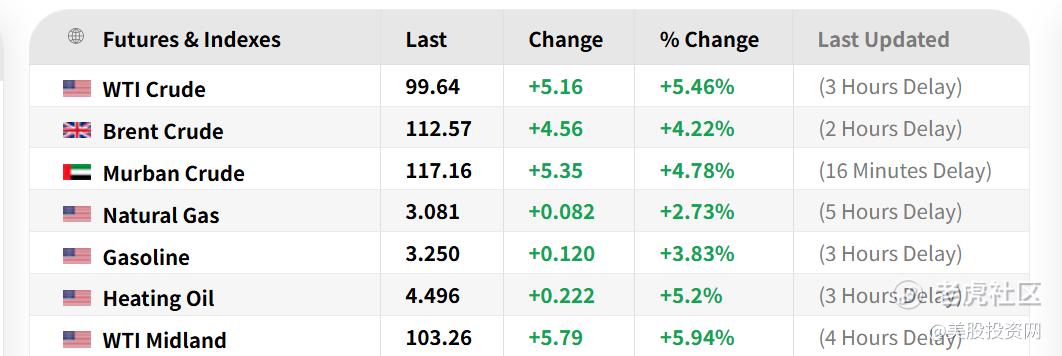 这直接戳中了能源市场最敏感的神经。美股投资网调研数据显示,亚洲原油市场已经出现现货短缺,市场的定价逻辑从“流量可能中断”变成了“库存实质性枯竭”。WTI原油现货价格盘中单边狂飙近8%,强力突破100美元关口;中东阿曼迪拜原油期货也大涨超5.5%。