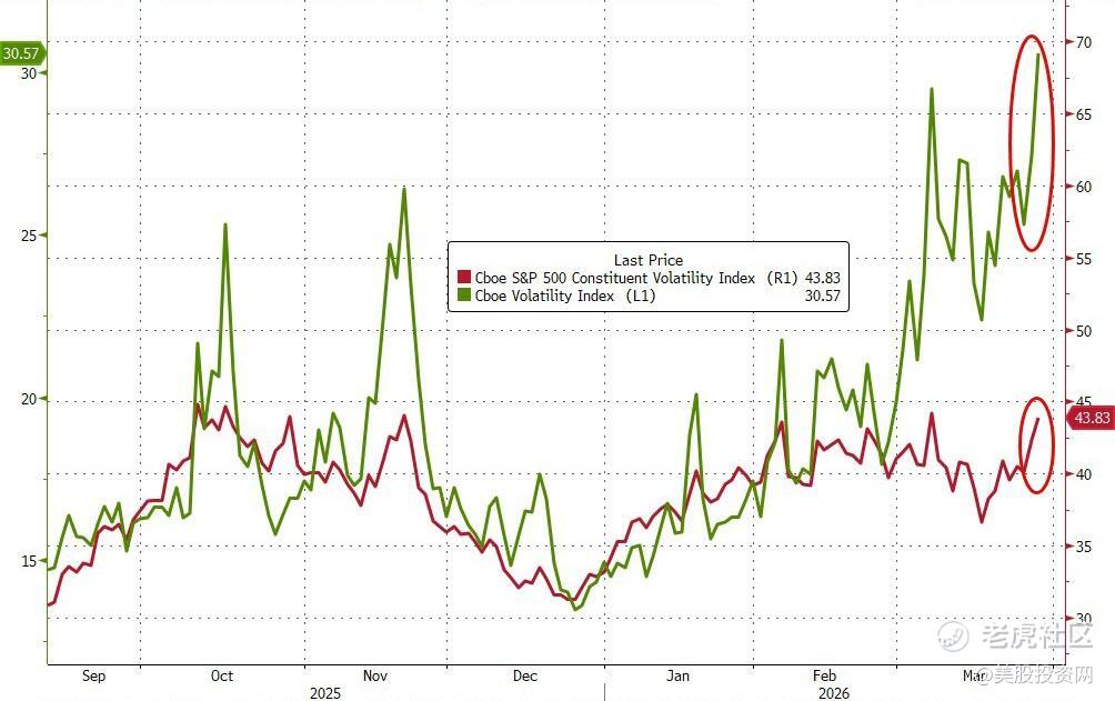 原油的狂飙直接拉爆了市场的恐慌情绪。衡量波动率的VIX指数盘中直线拉升,最终收于31.05,正式突破30这道生死线。