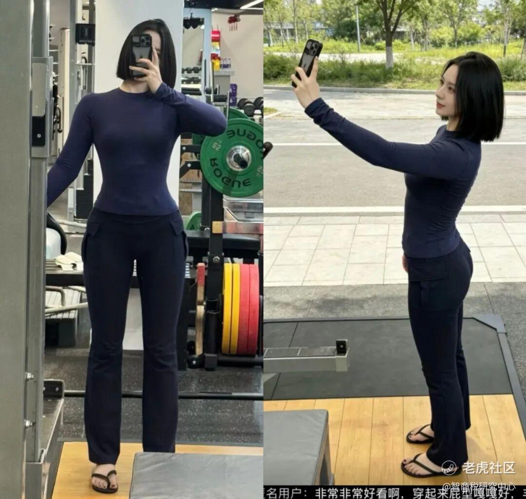 网友橙子在拼多多某服装店铺,买了一条裤子,穿着它在健身房运动时,觉得裤子很不错,就拍了张自拍追评。