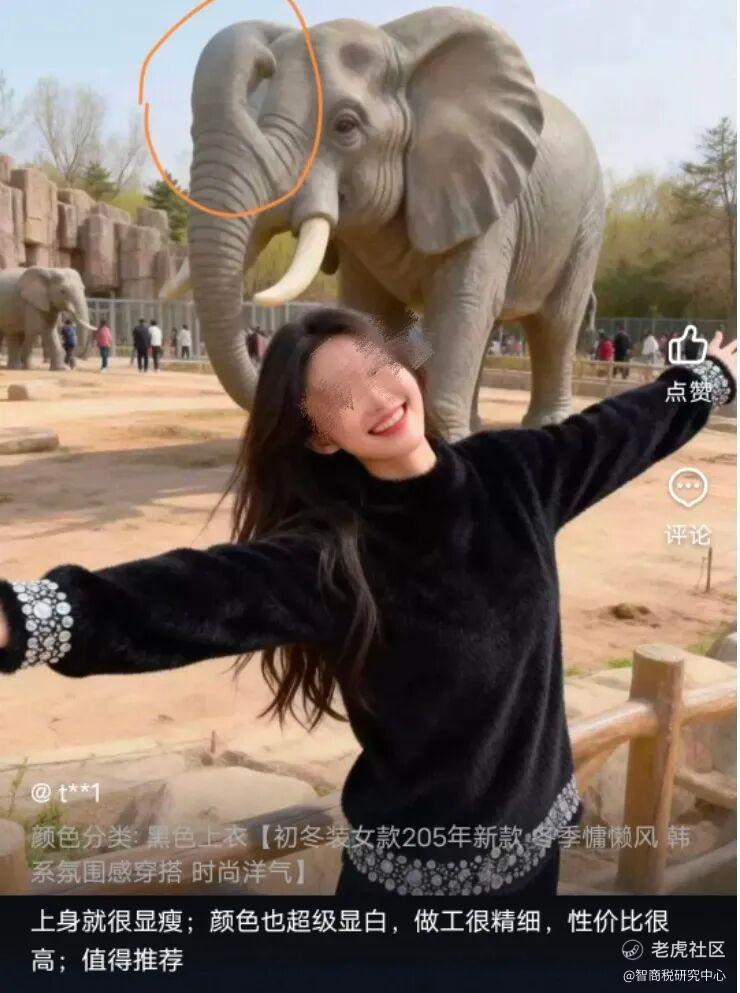 而在某冬装店铺评价区,背景里的大象头部变异,就连网红疆域阿力木来了,可能都要说一句:“你这背景太假了。”