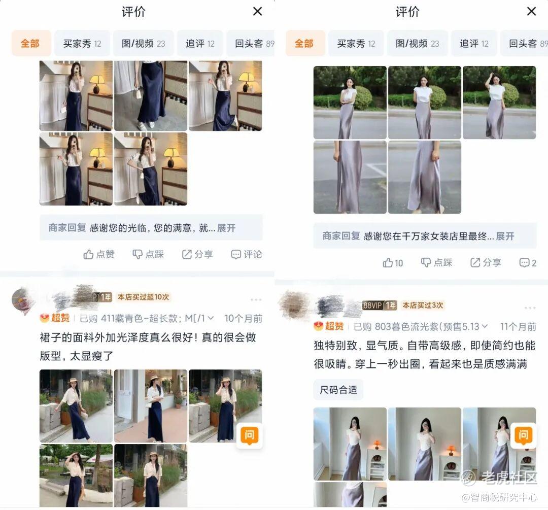 比如,潘哥在淘宝某女装店铺发现,一款连衣裙的评价区,前排晒图高度相似:身材高挑的模特,均身着白色上衣,站在漂亮的背景前拍照。
