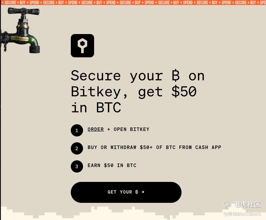 再回到 Block 的活动本身,我们可以发现页面上的奖励分三档:在 Cash App 购买 10 美元以上的 BTC,返还 5 美元 BTC;用比特币向 Square 商家付款,返还 25 美元 BTC;把 BTC 提取到 Bitkey 硬件钱包,返还 50 美元 BTC。