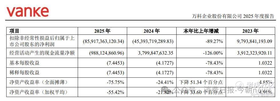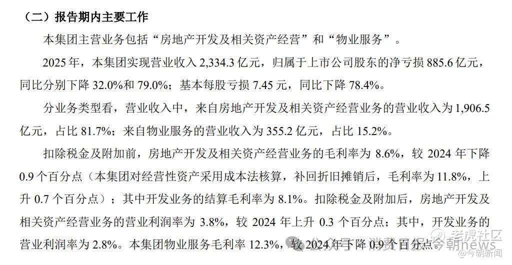 《今朝新闻》梳理万科2025年年度财报核心数据发现,报告期内公司实现营业总收入2334.33亿元,同比大幅下滑31.98%。营业利润亏损709.99亿元,同比降幅扩大至55.55%。利润总额亏损739.24亿元,同比下滑56.66%。