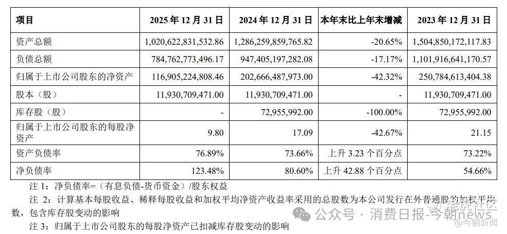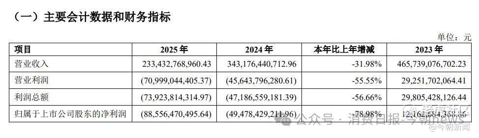 其中,归属于上市公司股东的净利润亏损885.56亿元,同比下滑78.98%。扣除非经常性损益后的归母净利润仍亏损859.17亿元,同比降幅高达89.27%。这一业绩表现不仅远低于市场预期,也印证了年报中的“经营业绩远未达股东预期”。据了解,2024-2025两年间,公司累计亏损规模已突破1380亿元。