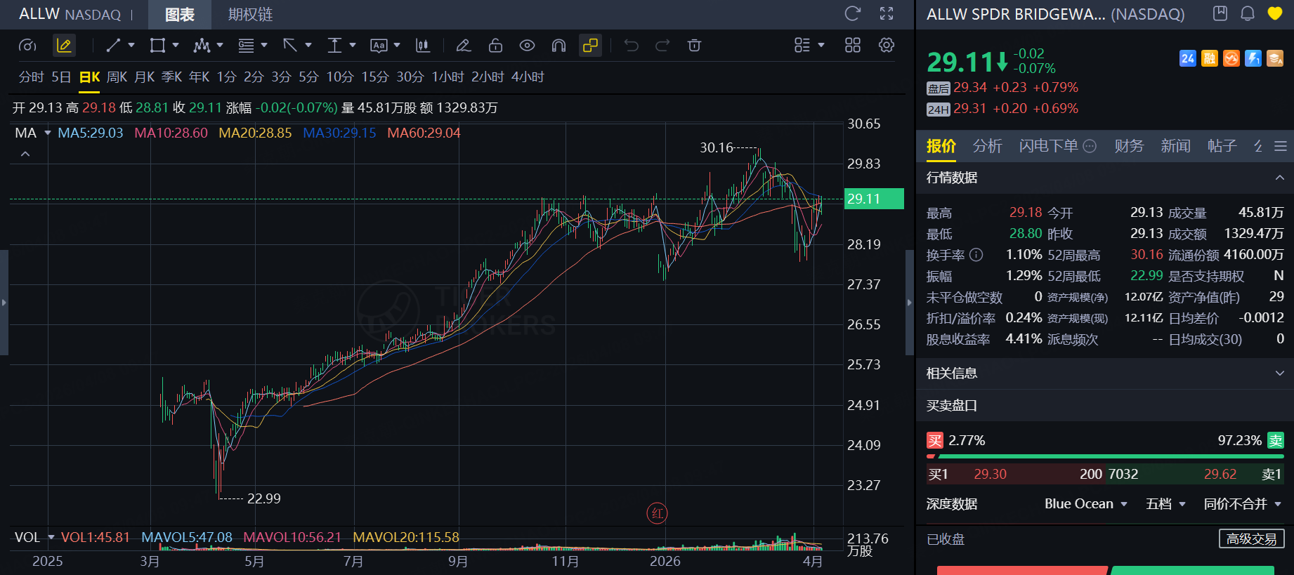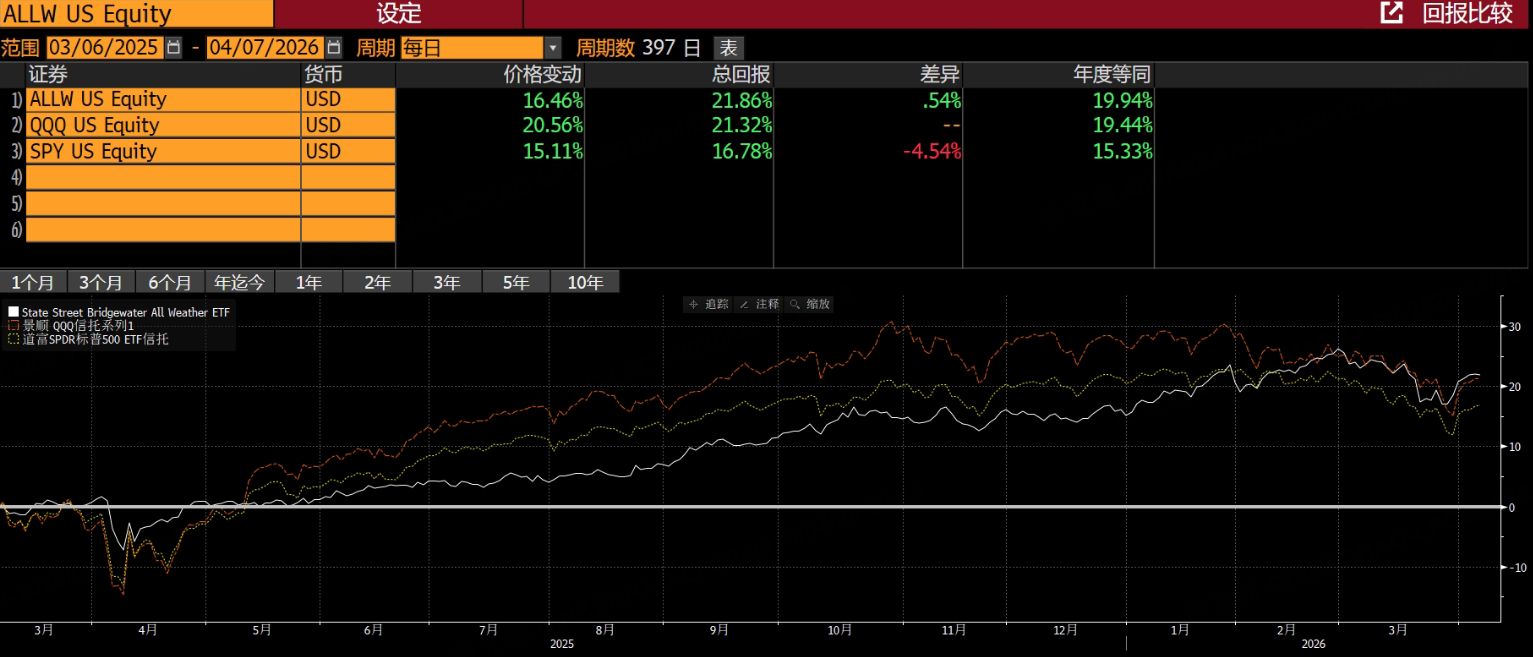 上市以来, $SPDR BRIDGEWATER ALL WEATHER ETF(ALLW)$ 取得了不错的回报,跑赢了宽基ETF—— $纳指100ETF(QQQ)$ 和 $标普500ETF(SPY)$ :2025年3月6日至2026年4月7日, $SPDR BRIDGEWATER ALL WEATHER ETF(ALLW)$ 价格涨幅16.46%,低于同期 $纳指100ETF(QQQ)$ 20.56%的涨幅,高于 $标普500ETF(SPY)$ 15.11%的涨幅。将分红再投资考虑在内, $SPDR BRIDGEWATER ALL WEATHER ETF(ALLW)$ 的总回报达到21.86%,高于 $纳指100ETF(QQQ)$ 21.32%的回报,远高于 $标普500ETF(SPY)$ 的16.78%:
