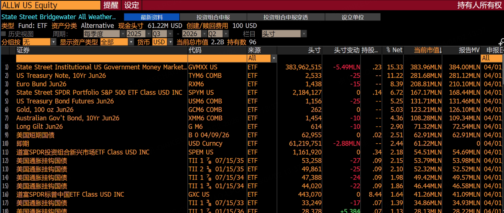 从持仓情况来看, $SPDR BRIDGEWATER ALL WEATHER ETF(ALLW)$ 第一大持仓标的是SSGA 美国政府货币市场基金,占净值的15.3%;第二大持仓是美国10年期国债,占净值的11%;第三大持仓是欧元债券,占比8.4%;第四大持仓是 $投资组合标普500指数ETF-SPDR(SPYM)$ ,占比6.7%;另持有黄金、国债期货、 $中国ETF-SPDR S&P(GXC)$ 等:
