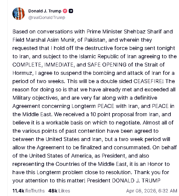and subject to the Islamic Republic of Iran agreeing to the COMPLETE, IMMEDIATE, and SAFE OPENING of the Strait of Hormuz, I agree to suspend the bombing and attack of Iran for a period of two weeks[开心]