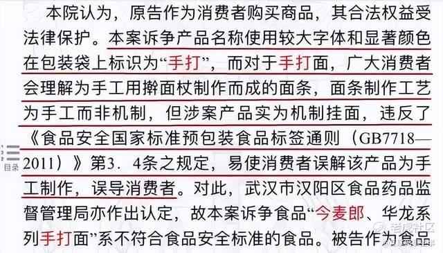 据中国消费者报,此前曾有消费者徐纲购买“今麦郎、华龙系列手打面”产品,共计价值1121.1元。后以所购产品面系普通机制挂面而非手工制作挂面为由,向法院提起诉讼的案例。最终,法院认定产品标签标示违反《食品安全法》,判令商家 “退一赔十”,商家需赔偿消费者1.1万余元。