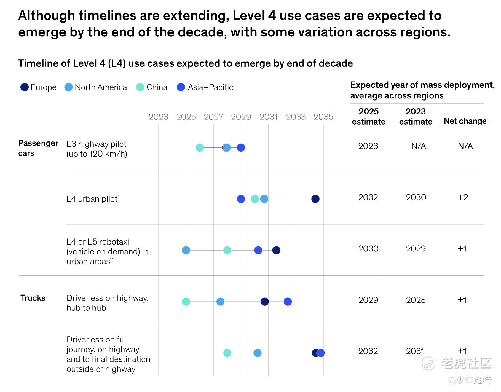 现在业内普遍感受是自动驾驶落地时间在拉长、开发成本在上升。年初麦肯锡给的预测普遍推了1-2年。