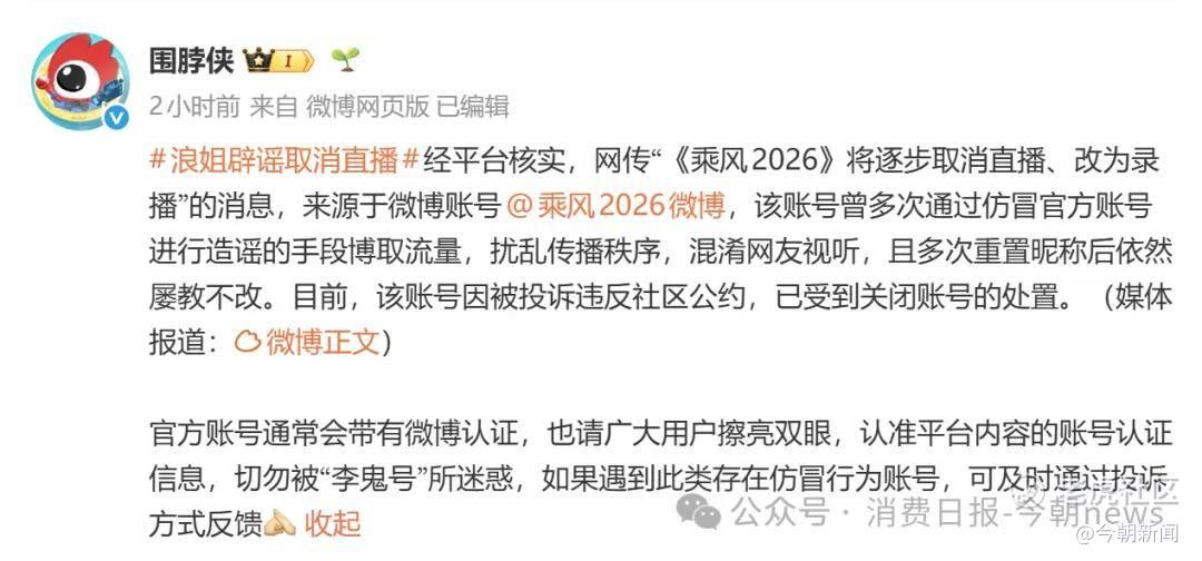 经平台核实,网传“《乘风2026》将逐步取消直播、改为录播”的消息,来源于微博账号@乘风2026微博,该账号曾多次通过仿冒官方账号进行造谣的手段博取流量,扰乱传播秩序,混淆网友视听,且多次重置昵称后依然屡教不改。目前,该账号因被投诉违反社区公约,已受到关闭账号的处置。