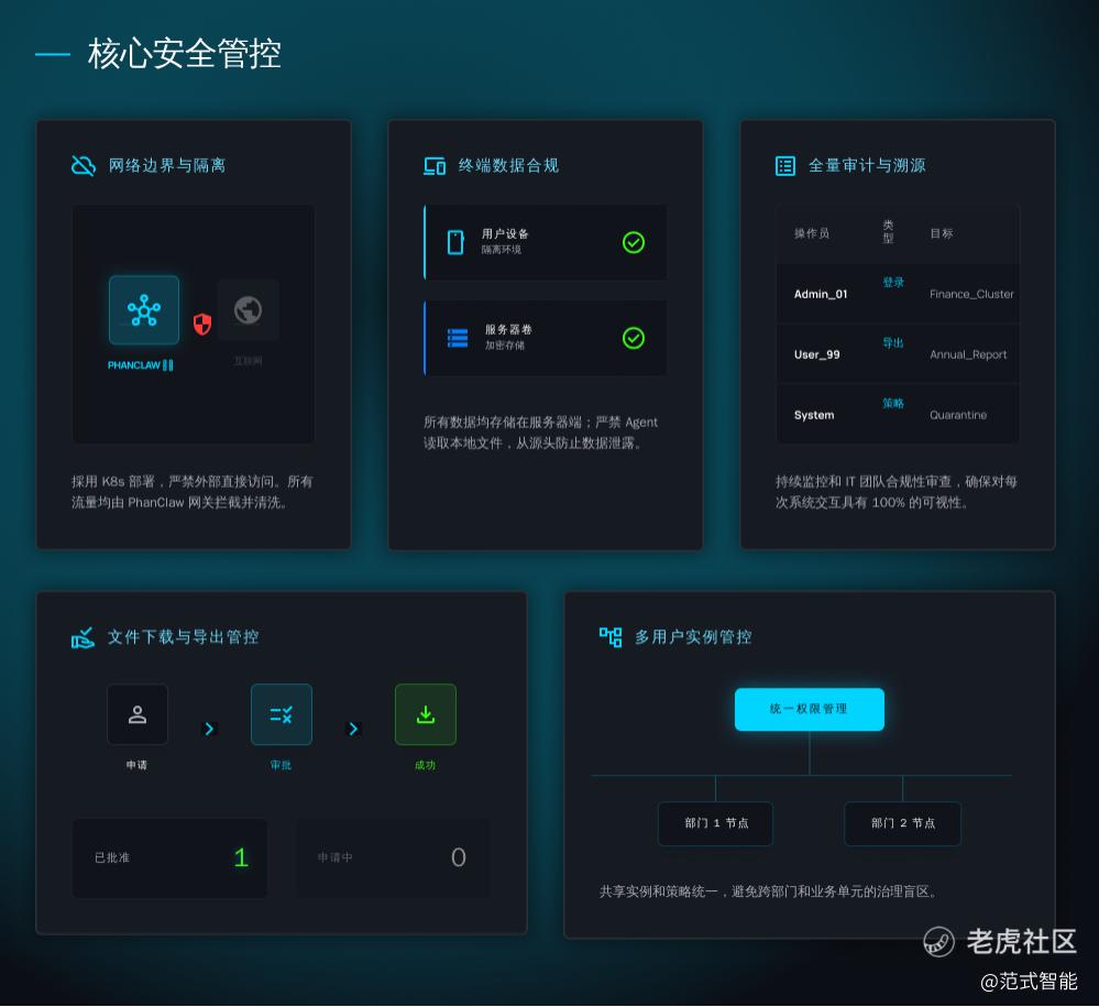 范式认为,AI智能体进入生产环境(或个人工作流),不应以牺牲安全为代价。PhanClaw的核心逻辑是:让Agent成为资产而非隐患。从架构级的内网隔离到流程级的全量审计,范式将安全能力内嵌于产品血液。