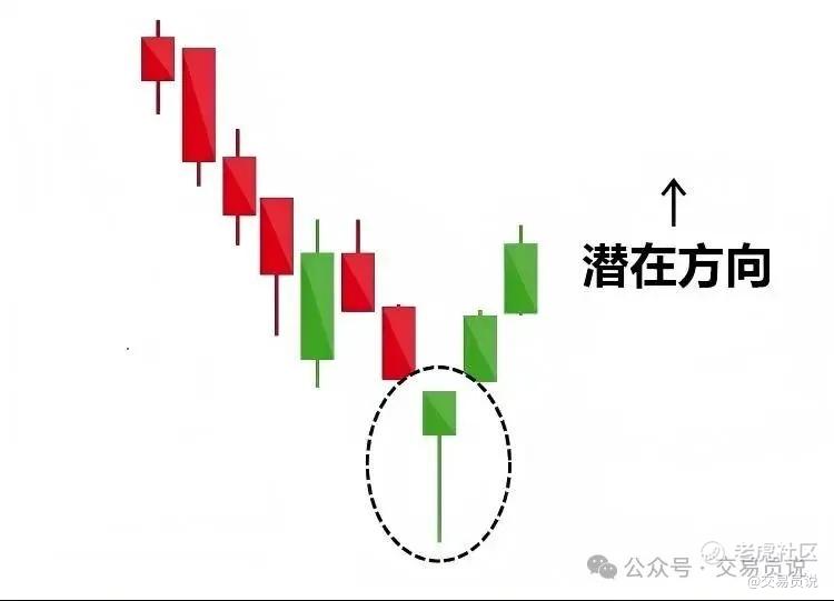 锤子线(Hammer)是一种出现在下跌趋势底部的单根K线形态。其特征是:实体较小,位于K线顶部附近;下影线较长,长度至少为实体的两倍;上影线很短或几乎不存在。