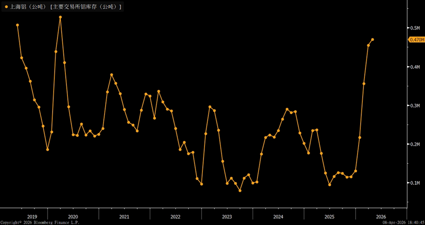 国内直线累库:上海期货交易所的铝库存在进入2026年一季度后,走出了一个极其陡峭的“V型”反转,从此前约0.1M的低谷呈直线(近乎垂直)暴增至目前的0.470M。