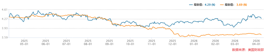 在收益率曲线上,截至2026年4月8日最新数据,美国10年期国债收益率录得4.29%,3个月期国债收益率录得3.69%。观察图表最右侧(3月末至4月初)的近期走势形态,在最近一周的观测窗口内,3个月期短端收益率(黄线)近期几乎维持水平横盘,走势极度平稳;而10年期长端收益率(蓝线)在经历了前期的快速上行后,近期在高位出现了小幅的回落与震荡。两者之间稳定维持着约60个基点的正向利差。