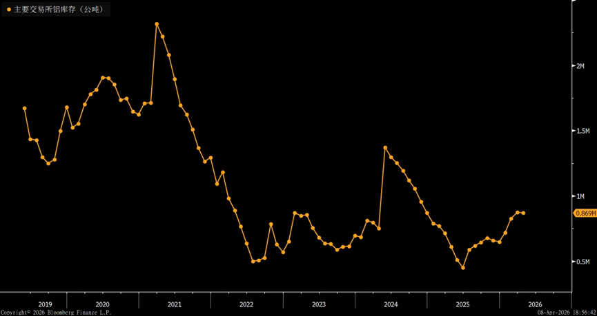 截至2026年4月初最新数据,全球主要交易所铝库存总计录得约0.869M(86.9万吨)。其中,LME铝库存约0.412M(41.2万吨),上海铝库存激增至0.470M(47.0万吨),而COMEX铝库存仅约2192吨。