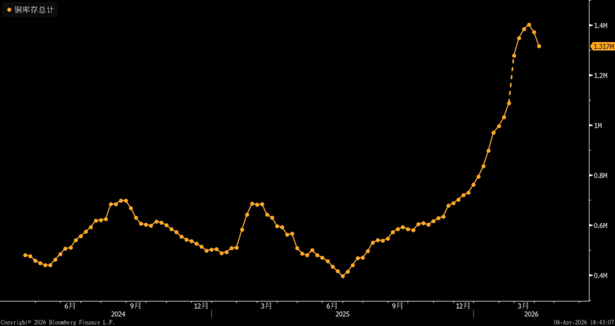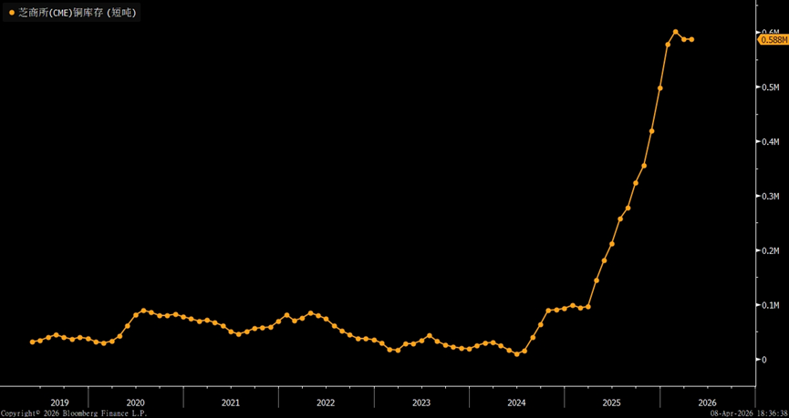 从绝对水平与历史分位来看,截至2026年4月初最新数据,全球铜显性库存总计录得约1.317M(约131.7万吨)。其中,CME铜库存约0.588M(58.8万短吨),LME铜库存约0.482M(48.2万吨),上海铜库存约0.301M(30.1万吨)。拉长周期来看,从2025年下半年至2026年一季度,全球铜库存经历了一轮斜率极其陡峭的爆炸式攀升。目前三大交易所的单边库存及全球总库存,均远远突破了2019年至2025年的历史峰值,处于近年来绝对的历史极高水位。