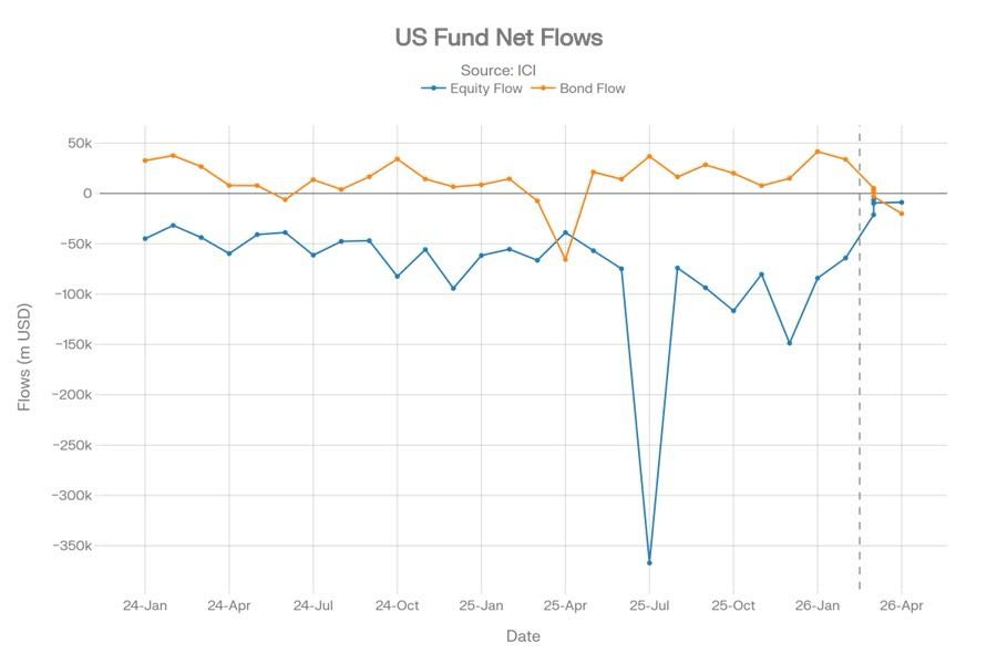 美股资金仍为净流出:截至2026年4月1日当周,美国股票型基金单周净流出88.6亿美元,仍未转为净流入,说明权益类共同基金整体仍处于资金撤出阶段,显示资金情绪并未实质性反转。