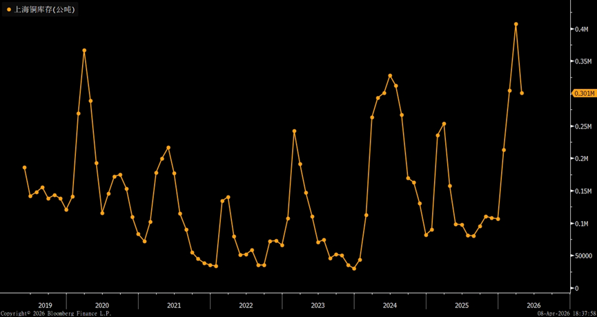 从边际变化看,尽管整体水位极高,但观察图表最右侧(近期)的边际形态可以发现,各大交易所的铜库存走势发生了一致性的边际逆转。在经历了长达大半年的单边直线上行后,全球铜库存总计曲线在突破1.4M后出现了明显的向下“拐头”。具体分项来看:LME、CME以及上海期货交易所的铜库存在最新一周均录得了不同程度的环比下降(走势曲线上最近的一个或几个数据点均呈下跌态势)。这一边际变化客观表明,在经历极其夸张的历史性累库后,全球主要交割库在近期首次迎来了阶段性的、一致性的去库拐点。