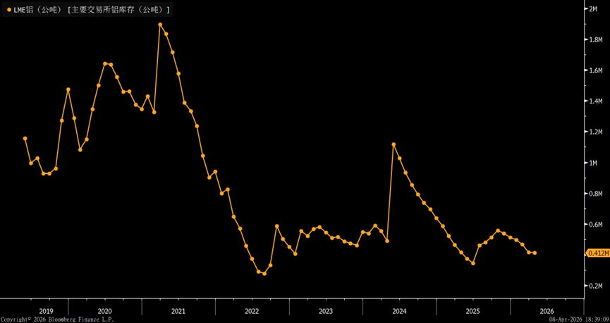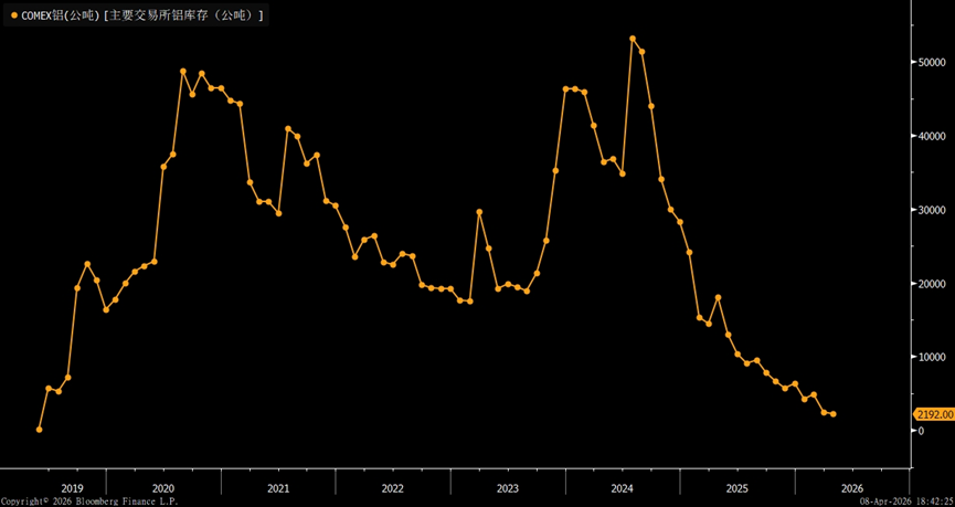 海外持续去库:LME铝库存(降至0.412M)和COMEX铝库存(仅2192吨)在最近几周依然保持着向下的去化斜率,显示海外市场铝锭现货流通依然极度偏紧。
