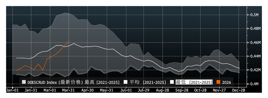 从边际变化看,在进入3月份之后,无论是全美商业库存还是库欣地区库存,代表2026年走势的橙线均呈现出明显的上翘斜率。截至2026年3月27日当周,EIA数据显示美国商业原油库存较前一周增加了545.1万桶;同期,美国原油主要交割地库欣地区的库存也录得52.0万桶的增加。综合图表数据表现,北美原油在商业储罐环节确实出现了连续的累库动作,这导致全美商业原油库存的绝对量从年初的低于历史均值,迅速向上攀升并触及五年历史平均线水平。