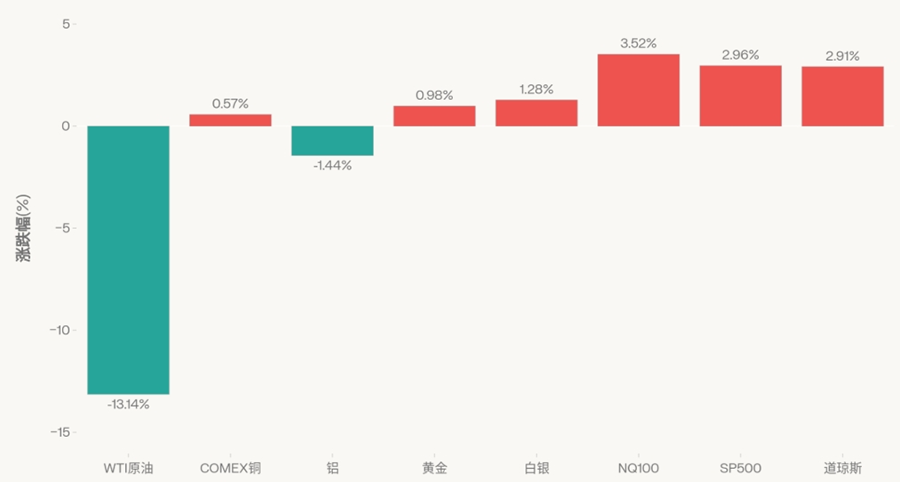 截至2026年4月9日下午五点左右,本周重点资产涨跌幅情况如下: