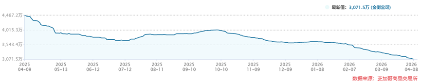 库存端(实物基本面):截至2026年4月8日最新数据,COMEX黄金库存最新值录得3,071.5万金衡盎司,白银库存最新值录得3.25亿金衡盎司。