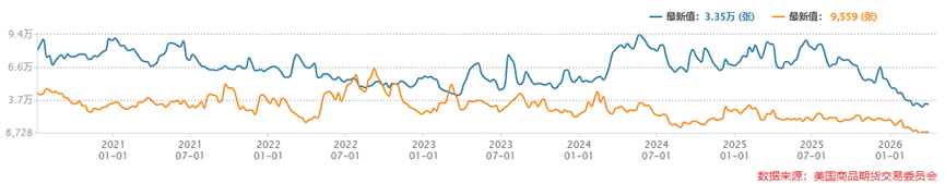 资金端(持仓面):截至近期最新数据,COMEX黄金的非商业多头持仓(蓝线)为20.76万张,空头持仓(黄线)为4.44万张;COMEX白银的非商业多头持仓(蓝线)为3.35万张,空头持仓(黄线)为9,559张。