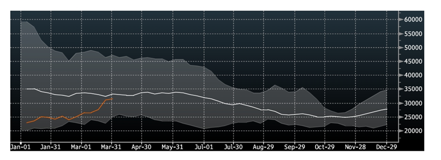 库欣地区原油库存: 在美国原油主要交割地库欣地区,2026年的库存曲线(橙线)走势同样表现出连续上行。但与全美库存不同的是,库欣地区当前的绝对水位(约30,000至35,000区间)明显低于2021-2025年的历史均值(白线),处于五年历史区间的偏低分位点。